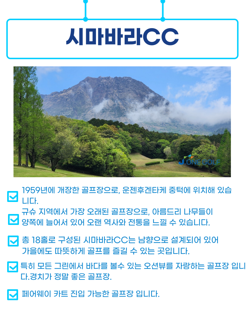 👉실제 예약시 홈페이지에 기재되어 있는 요금과 상이할수 있습니다.(항공료 변동 or 현지 써차지기간 적용) 👉원하시는 일정에 대한 정확한 견적을 원하실경우 "가격문의" or "카카오톡실시간채팅상담" 통하여 견적요청 부탁드립니다. 👉고객님께서 만족할 만한 최저가 견적서를 보내드리겠습니다. ※ 골프 인상 적용일 : 4/29~5/6, 7/20, 8/11, 9/19~23, 10/12 휴일 골프에 대해 +10만원/1인 18홀당 추가 인상 적용. ⛳나가사키 골프 체크 포인트!!!!!⛳ ✅ 최적의 동선! 🔸대한항공 직항으로 1시간반 소요! 짧은 비행시간으로 피로감이덜합니다! (대한항공으로 넉넉한 수화물까지!🤩👍) ✅2인출발가능! 🔸부담없이 2인으로 출발 가능합니다. ✅골프 + 온천 올포함 상품 🔸골프 + 온천 + 휴양 + 올포함 4가지를 모두 갖춘 온천 휴양형 올포함 상품입니다!! 🔸천연온천이 있기 때문에 라운딩하시고 온천하고 휴식취하시기 좋습니다👍 🔸라운딩 후 온천 휴식하며 식당 찾아다닐 필요없습니다! 석식 호텔 뷔페식 노미호다이 추가시 (90분간 주류무제한) ✅ 최고급 온천 호텔 이용 🔸각골프장에서-호텔까지 20분 🔸운젠지옥온천 국립공원 도보5분거리 🔸석식 디저트만 드셔도 본전 뽑는 메뉴 ✅바다를 볼수 있는 오션뷰 골프장⛳ 🔸시마바라CC는모든 그린에서 바다를 볼수 있는 경치가 정말 좋은 골프장 입니다. 🔸1959년에 개장한 골프장으로 규슈 지역에서 가장 오래된 골프장입니다 🔸아름드리 나무들이 양쪽에 늘어서 있어 오랜 역사와 전통을 느낄 수 있습니다.