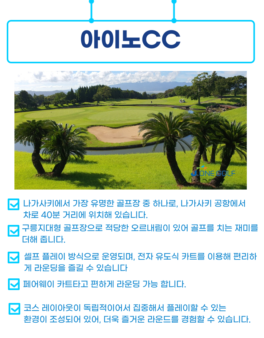 👉실제 예약시 홈페이지에 기재되어 있는 요금과 상이할수 있습니다.(항공료 변동 or 현지 써차지기간 적용) 👉 원하시는 일정에 대한 정확한 견적을 원하실경우 "가격문의" or "카카오톡실시간채팅상담" 통하여 견적요청 부탁드립니다. 👉 고객님께서 만족할 만한 최저가 견적서를 보내드리겠습니다. ※ 골프 인상 적용일 : 4/29~5/6, 7/20, 8/11, 9/19~23, 10/12 휴일 골프에 대해 +10만원/1인 18홀당 추가 인상 적용. ⛳나가사키 골프 체크 포인트!!!!!⛳ ✅ 최적의 동선! 🔸대한항공 직항으로 1시간반 소요! 짧은 비행시간으로 피로감이덜합니다! (대한항공으로 넉넉한 수화물까지!🤩👍) ✅2인출발가능! 🔸부담없이 2인으로 출발 가능합니다. ✅골프 + 온천 올포함 상품 🔸골프 + 온천 + 휴양 + 올포함 4가지를 모두 갖춘 온천 휴양형 올포함 상품입니다!! 🔸천연온천이 있기 때문에 라운딩하시고 온천하고 휴식취하시기 좋습니다👍 🔸라운딩 후 온천 휴식하며 식당 찾아다닐 필요없습니다! 석식 호텔 뷔페식 노미호다이 추가시 (90분간 주류무제한) ✅ 최고급 온천 호텔 이용 🔸각골프장에서-호텔까지 20분 🔸운젠지옥온천 국립공원 도보5분거리 🔸석식 디저트만 드셔도 본전 뽑는 메뉴 ✅바다를 볼수 있는 오션뷰 골프장⛳ 🔸시마바라CC는모든 그린에서 바다를 볼수 있는 경치가 정말 좋은 골프장 입니다. 🔸1959년에 개장한 골프장으로 규슈 지역에서 가장 오래된 골프장입니다 🔸아름드리 나무들이 양쪽에 늘어서 있어 오랜 역사와 전통을 느낄 수 있습니다.