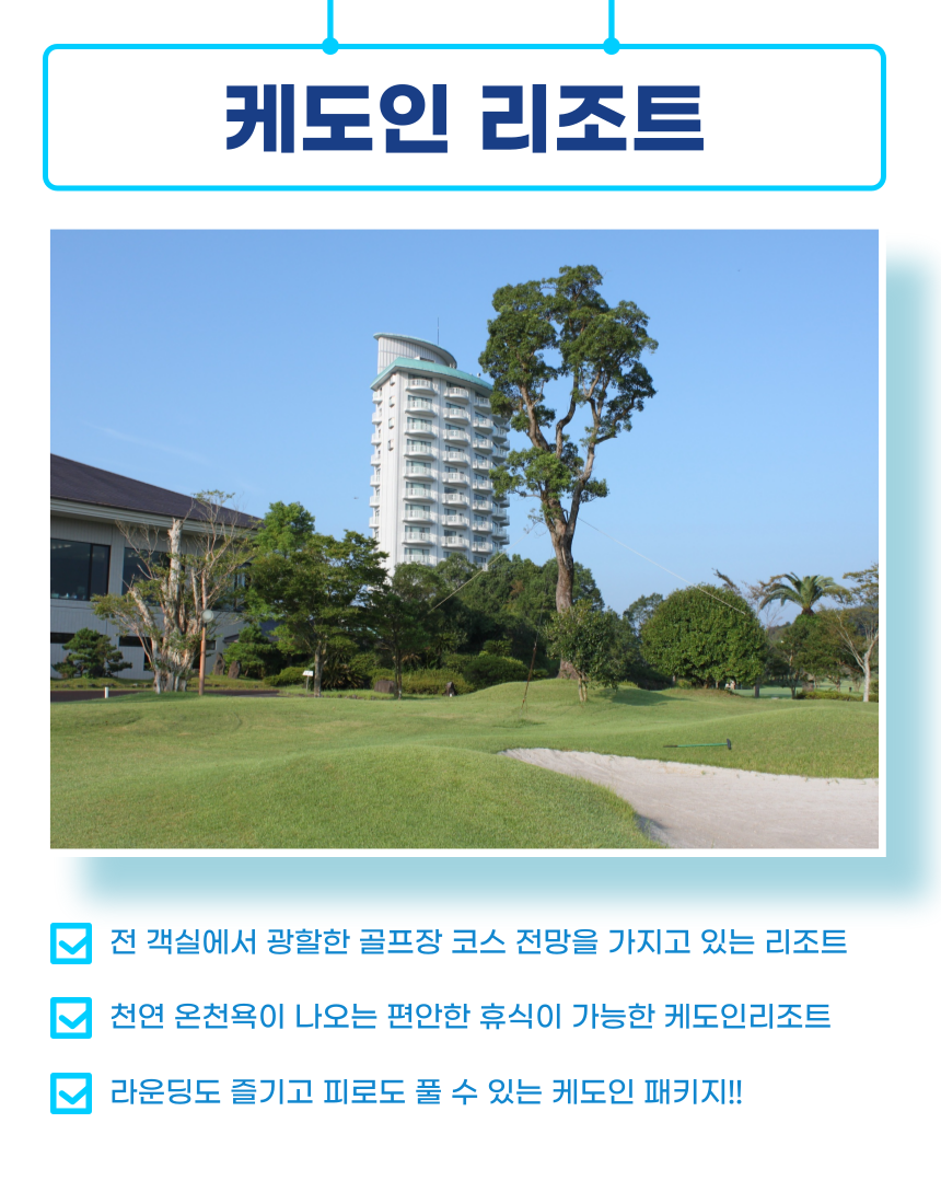 👉실제 예약시 홈페이지에 기재되어 있는 요금과 상이할수 있습니다.(항공료 변동 or 현지 써차지기간 적용) 👉원하시는 일정에 대한 정확한 견적을 원하실경우 "가격문의" or "카카오톡실시간채팅상담" 통하여 견적요청 부탁드립니다. 👉고객님께서 만족할 만한 최저가 견적서를 보내드리겠습니다. ✅가고시마 대한항공 ~5/31 항공패턴 🩵 매일운항 인천->가고시마 16:20 - 17:55 가고시마-> 인천 18:55 - 20:50 ✅가고시마 대한항공 06/01~09/17 항공패턴 🩵 2박3일 [화요일/목요일 출발] 인천->가고시마 16:20 - 17:55 가고시마-> 인천 18:55 - 20:50 🩵 3박4일 [토요일 출발] 인천->가고시마 16:20 - 17:55 가고시마-> 인천 18:55 - 20:50 🩵 4박5일 [화요일 출발] 인천->가고시마 16:20 - 17:55 가고시마-> 인천 18:55 - 20:50 🩵 5박6일 [목요일,툐요일 출발] 인천->가고시마 16:20 - 17:55 가고시마-> 인천 18:55 - 20:50 🟠호 텔 변동일 3/19, 4/28~5/6 7/19 8/10 9/20,22 숙박 시 1인1박당 20,000 UP 🟠골 프 변동일 3/20 4/29~5/6 7/20 8/11 9/21,23 라운딩 시 1인1회당 50,000 UP 📌골든위크 별도 문의 📌정기 휴관 7/26 ~ 7/31 (6日間) 📌 라운딩 불가일 3/29 4/23,26 5/31 6/18,19,28 8/15,16,30 7/26~31 회원행사 및 대회 ⛳가고시마 케도인 골프 체크 포인트!!!!!⛳ 케도인CC & 리조트 상품 특징 🏨 고품격 리조트 체류형 상품 ♨ 리조트 내 온천 가능 👨‍💼 현지 한국인 스텝 상주 – 여행 내내 안심 서비스 🚜 페어웨이 카트 진입 가능 🏌️‍♂️ 상급 골프장 케도인CC 라운딩 포함 👫 2인 단독 플레이 보장 (~ 9/6까지) 🛍 매주 화·목요일 시내 쇼핑 투어 – 이온몰 방문 🍺 수~토요일 비어가든 – 뷔페 디너 & 주류 2시간 무제한 (~ 9/6까지) ⛳ 5박 이상 체류 시 → 9홀 서비스 라운딩 제공 (~ 9/6까지)