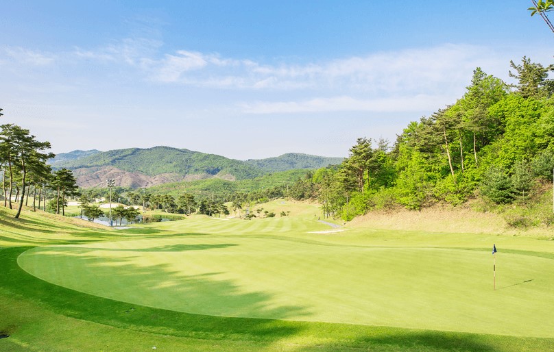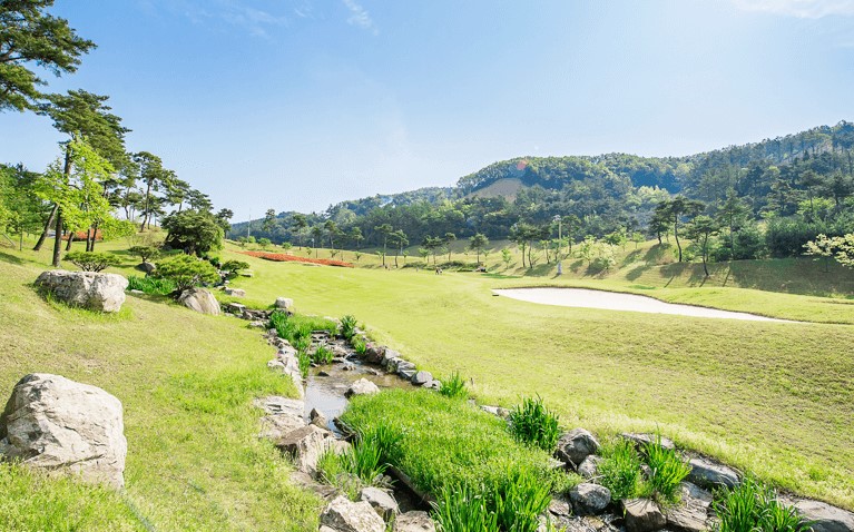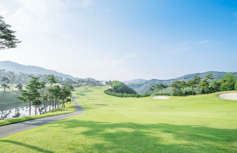 웅진코스 (9H) 다이내믹하며 도전적인 코스로 코스 전장이 9,878m로 긴 페어웨이와 벙커, 헤저드가 적절히 균형을 이루고 있어, 이 모두를 극복하며 느낄 수 있는 도전적인 코스입니다.